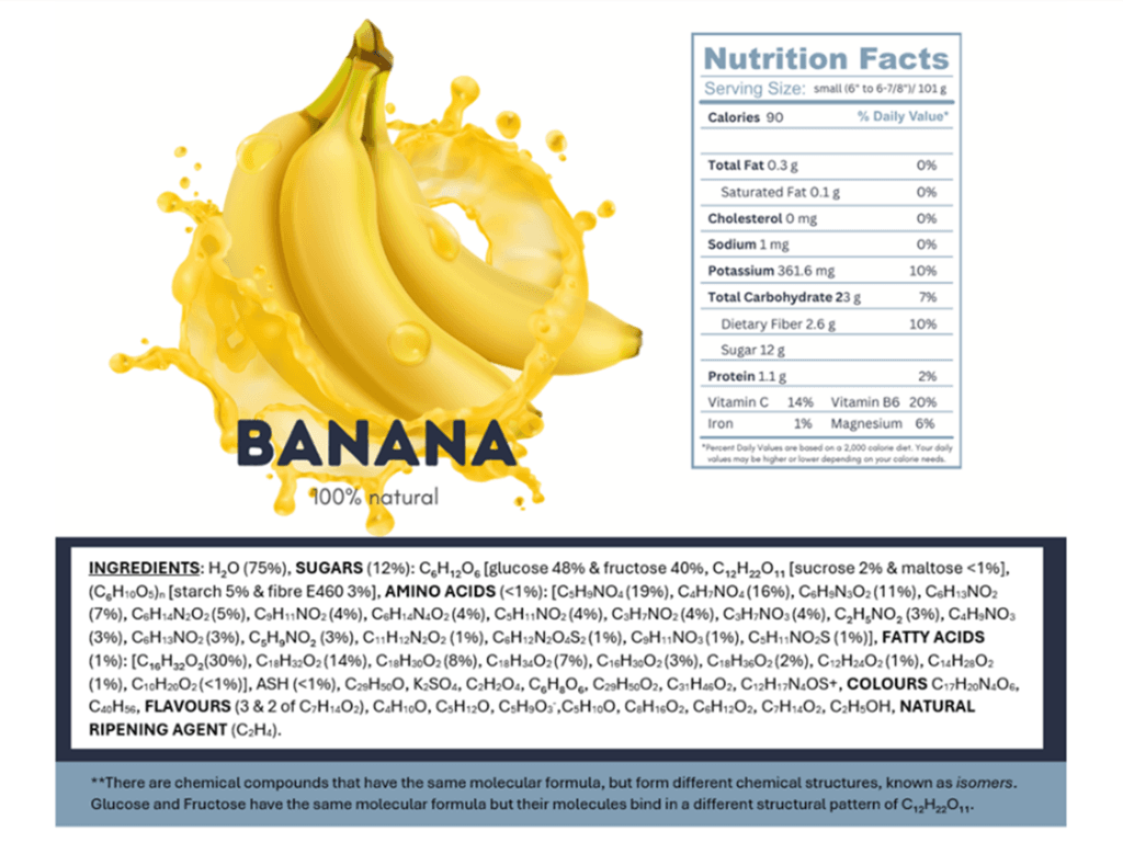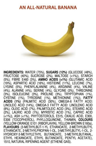 Let us take a simple example, the banana. Now if a banana were to have a food ingredient label, it would say 100% banana, and if it were an ingredient in another food, it would be listed simply as banana. Easy, right!? But what if you listed the composition of that banana, what would that label look like?