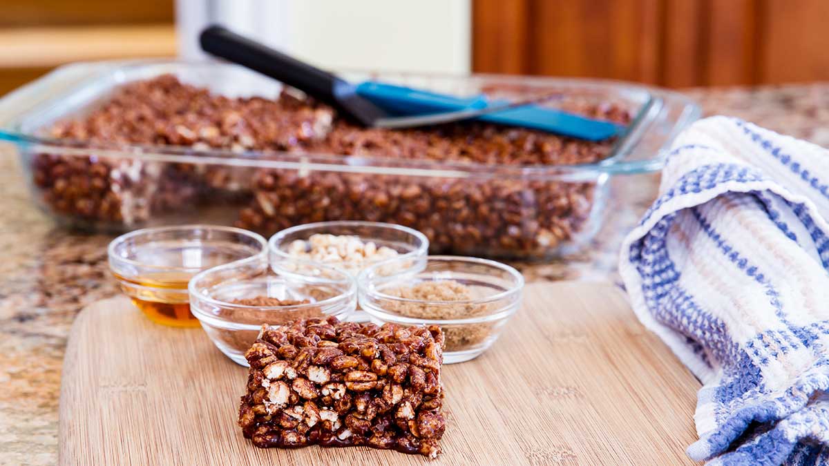 • Scrape the puffed wheat into the prepared pan and use damp hands (have a bowl of cold water nearby) to press it down evenly. Let it rest at room temperature for 3 hours before cutting.
